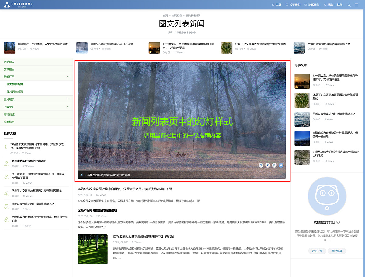 ⓮ “默认新闻列表模板”和“默认文章列表模板”上方我加了一个图片幻灯,它调用的是本栏以及下级栏目中的推荐文章且有封面图片的条目,这里我设置的是最多九条,多了手机上就放不开了,图片是调用的文章内容中第一张图;